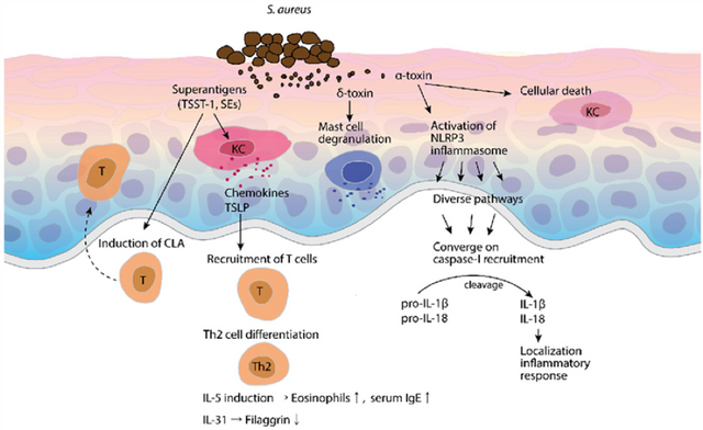 Pathogenesis or symptom exacerbation by S. aureus is due to expression of multiple virulence factors, as illustrated in the figure below.8 Other microorganisms that are normally found on healthy skin, such as fungi in the Malassezia genus, may have a role in promoting skin inflammation in patients with AD.9